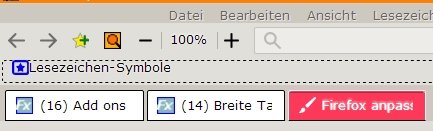 Die LZ-Symbolleiste sieht im Anpassmodus so aus. Da sieht man, dass der Schriftzug "Lesezeichensymbolleiste" zu hoch ist und nicht mittig.