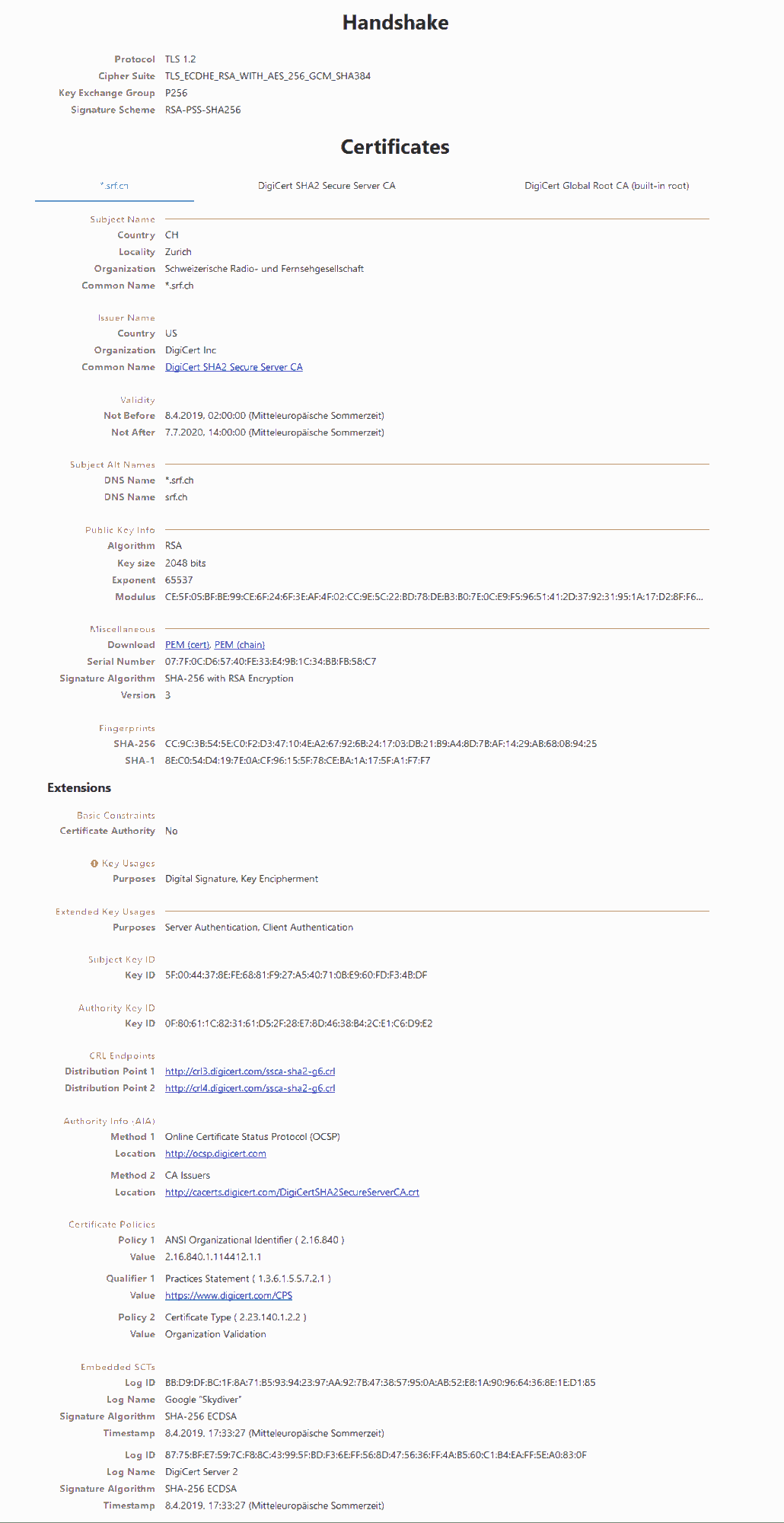 Anscheinend ist das Zertifikat von zB Santander ausführlicher als von srf, das sieht man auch. Beide sind gleich sicher, der Aussteller weicht ab.