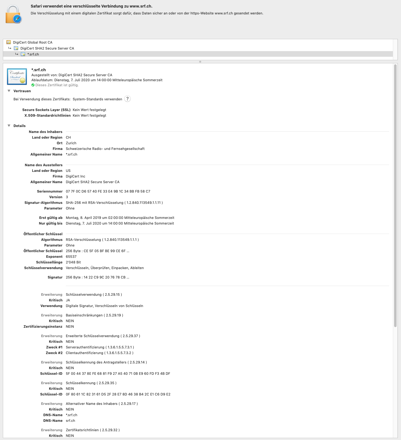 Dies obwohl die Informationen im Zertifikat vorhanden sind, wenn ich das auf Safari anschaue. (siehe Anhang)
