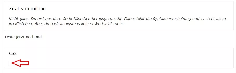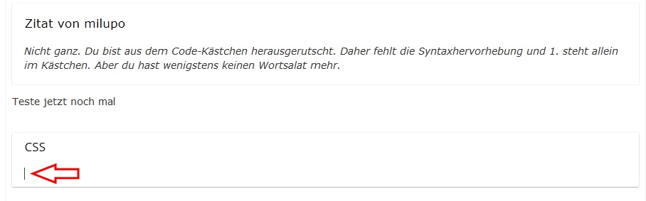 Ich habe im Beitrag vor diesem mal "Code" probiert. Es erscheint ja dann das Wort Quellcode im Text. Klicke dort drauf. Es öffnet sich ein Fenster und wähle dort unter Syntaxhervorhebung CSS aus. Der Code wir ordnungsgemäß eingefügt - jedenfalls bei mir - und du hast sogar den Code an bestimmten Stellen farblich hervorgehoben. Es steht dann auch CSS drüber.