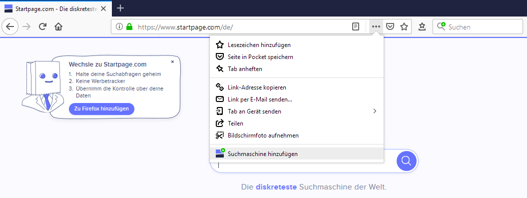 Hier bessert Mozilla mit Firefox 61 nach. Hinter dem Menü mit den drei Punkten in der Adressleiste ist ab Firefox 61 sichtbar, wenn eine Suchmaschine zu Firefox hinzugefügt werden kann.