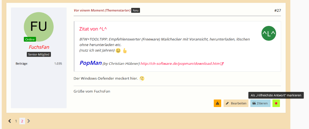 CSS.messageFooterButtons a.button[data-tooltip="Zitieren"] { background: #44f !important; } .messageFooterButtons a.button[data-tooltip="Als „Hilfreichste Antwort“ markieren"] { background: gold !important; }Gültig ist wie vorher aufgeschrieben der Code zum a.button.