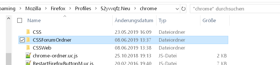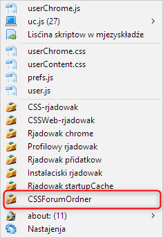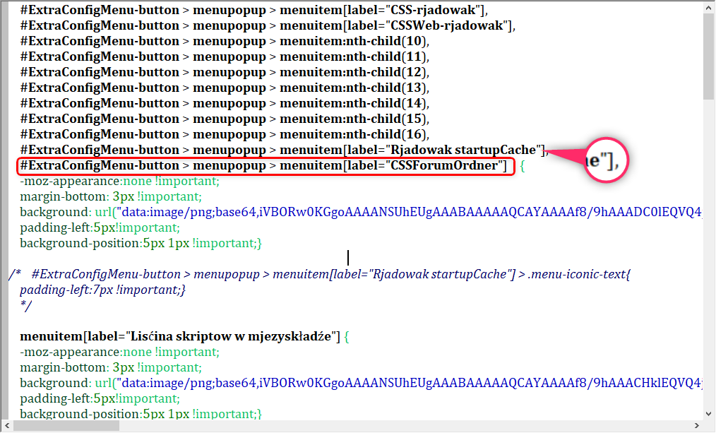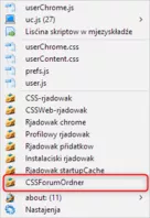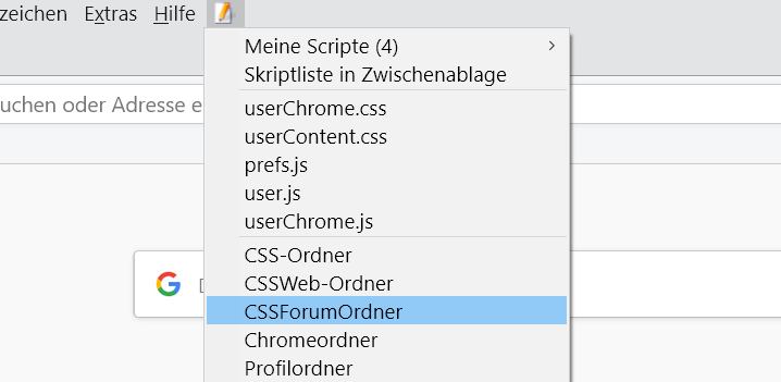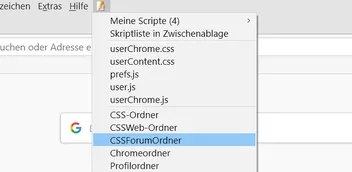 • BarbaraZ- Wenn du eine CSS-Datei zum extrag_config_menu.uc.js hast, bei mir heißt sie extra_config_menu.css, kannst du dort einen neue Zeile hinzufügen, die ein Symbol vor dem Menüeintrag CSSForumOrdner anzeigt. So sieht das bei mir in der Datei extra_config_menu.css aus: