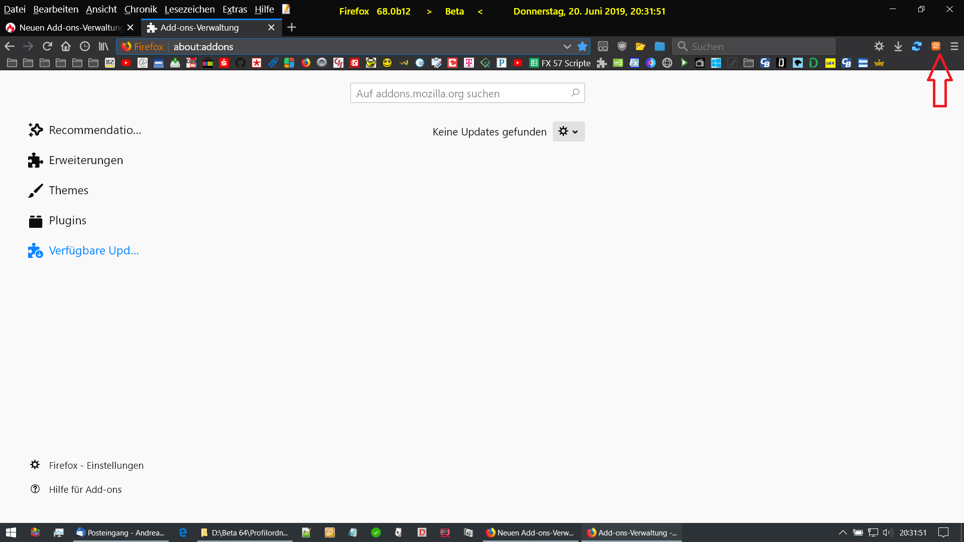 • Also, ich bin ratlos, was das Skript aus Beitrag #13 angeht. Die Ursache liegt wohl nicht direkt bei Firefox 68+, sondern beim neuen Add-on-Manager, denn mit dem alten Add-on-Manager wird auch hier im Nightly die Schaltfläche Aktualisieren entfernt.