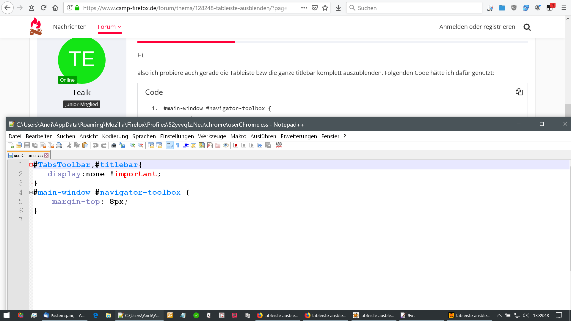 also sobald ich das Element #titlebar mit display: none; ausblende, hat sich das mit den Tabs erledigt; also sämtliche Tab-Funktionen.