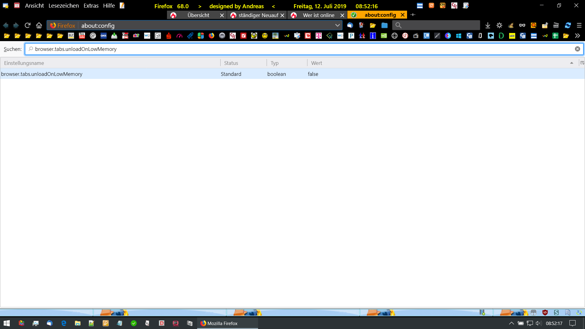 Der Versuch, über about:config den Wert browser.tabs.unloadOnLowMemory auf false umzustellen, lief ins Leere, da der Wert schon false ist.
