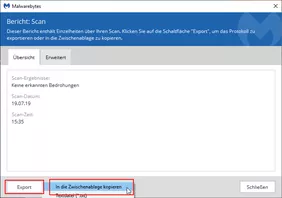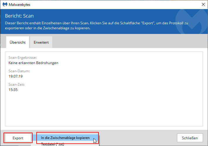 Alles anzeigenMalwarebytes www.malwarebytes.com -Protokolldetails- Scan-Datum: 19.07.19 Scan-Zeit: 16:21 Protokolldatei: 7e447c0a-aa30-11e9-8d1b-1860247484a4.json -Softwaredaten- Version: 3.8.3.2965 Komponentenversion: 1.0.613 Version des Aktualisierungspakets: 1.0.11630 Lizenz: Testversion -Systemdaten- Betriebssystem: Windows 10 (Build 18362.239) CPU: x64 Dateisystem: NTFS Benutzer: HEINER\User -Scan-Übersicht- Scan-Typ: Bedrohungs-Scan Scan gestartet von: Manuell Ergebnis: Abgeschlossen Gescannte Objekte: 330124 Erkannte Bedrohungen: 1 In die Quarantäne verschobene Bedrohungen: 0 Abgelaufene Zeit: 2 Min., 27 Sek. -Scan-Optionen- Speicher: Aktiviert Start: Aktiviert Dateisystem: Aktiviert Archive: Aktiviert Rootkits: Deaktiviert Heuristik: Aktiviert PUP: Erkennung PUM: Erkennung -Scan-Details- Prozess: 0 (keine bösartigen Elemente erkannt) Modul: 0 (keine bösartigen Elemente erkannt) Registrierungsschlüssel: 0 (keine bösartigen Elemente erkannt) Registrierungswert: 0 (keine bösartigen Elemente erkannt) Registrierungsdaten: 0 (keine bösartigen Elemente erkannt) Daten-Stream: 0 (keine bösartigen Elemente erkannt) Ordner: 0 (keine bösartigen Elemente erkannt) Datei: 1 PUP.Optional.Conduit, C:\USERS\USER\APPDATA\ROAMING\MOZILLA\FIREFOX\PROFILES\1BM22OMV.DEFAULT-1563540160592\PREFS.JS, Keine Aktion durch Benutzer, [207], [303091],1.0.11630 Physischer Sektor: 0 (keine bösartigen Elemente erkannt) WMI: 0 (keine bösartigen Elemente erkannt) (end) -