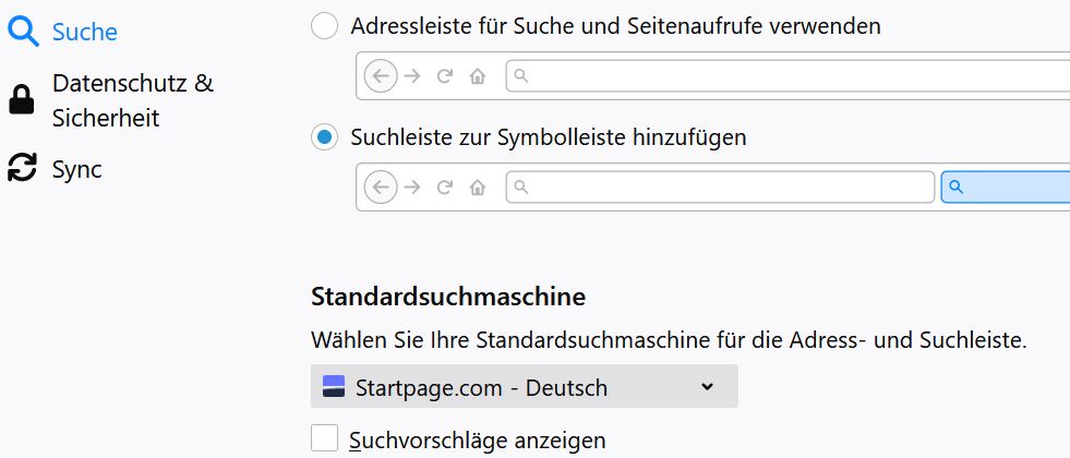 Als Standardsuchmaschine ist bei mir Startpage.com eingetragen.