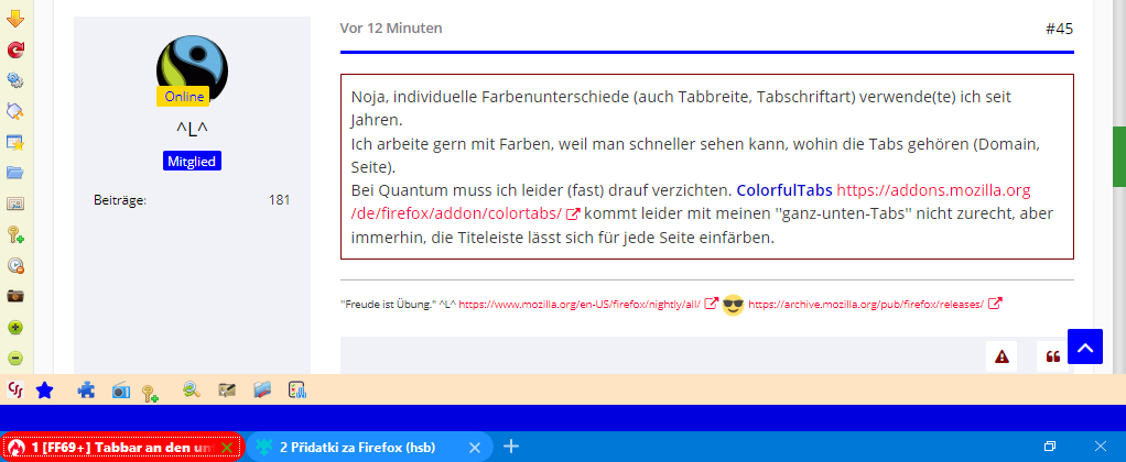 Bei Quantum muss ich leider (fast) drauf verzichten. ColorTabs https://addons.mozilla.org/de/firefox/addon/colortabs/ kommt leider mit meinen ''ganz-unten-Tabs'' nicht zurecht, aber immerhin, die Titeleiste lässt sich für jede Seite einfärben.