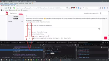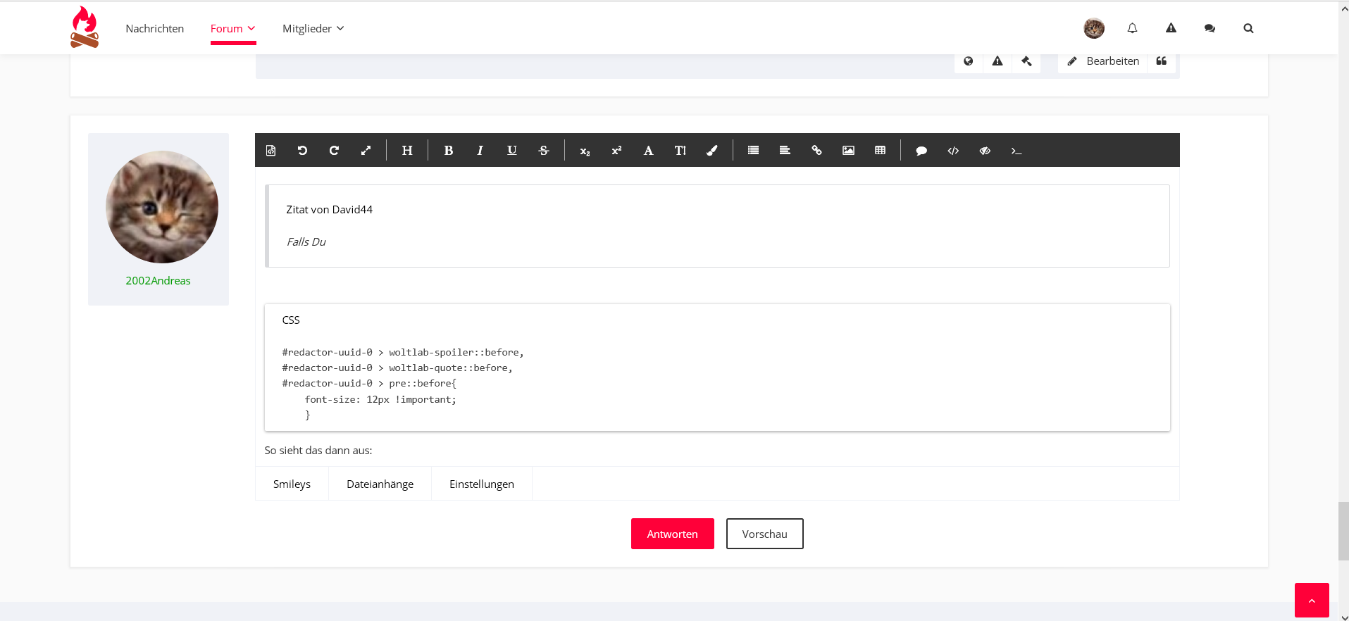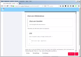 • Danke, gut ist jetzt: "Zitat" usw. und die linke Spalte. Leider wird der Textbereich dadurch nicht breiter, d.h. rechts ist jetzt weiße Fläche. Oben ist auch mit nochmals halbierten Werten für max-height keine Änderung zu sehen. Die Avatar-Bilder haben sich in der Größe auch nicht geändert.