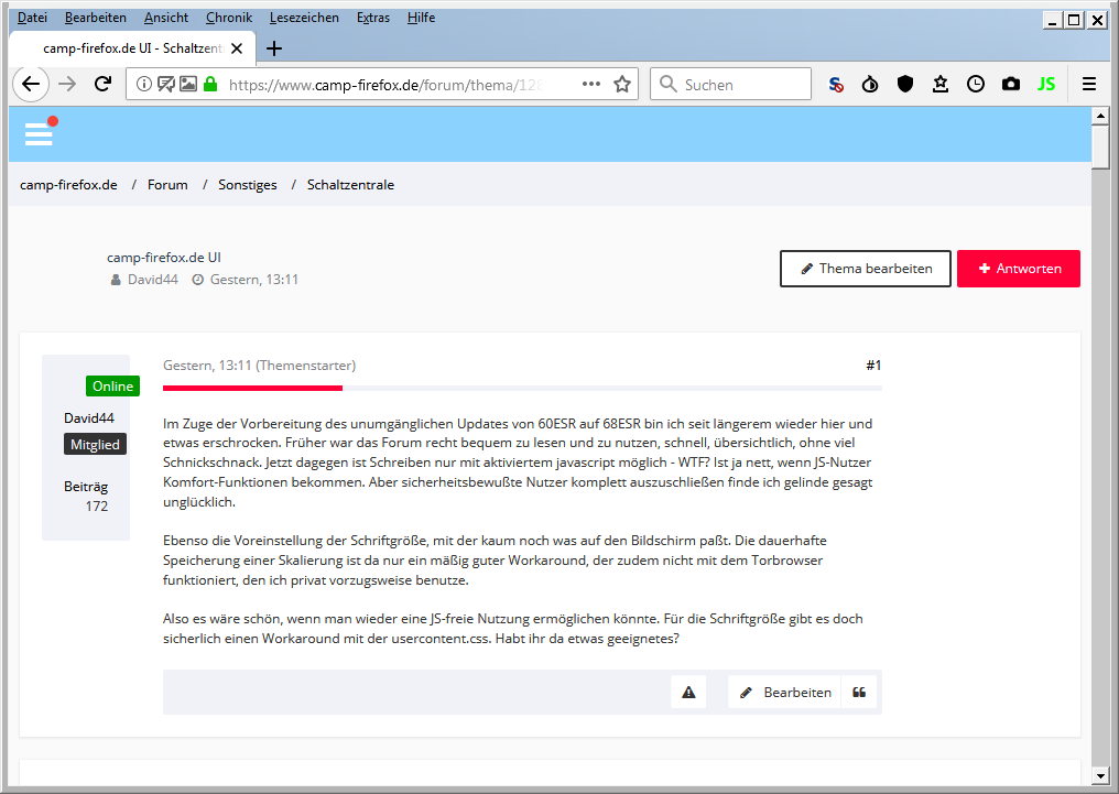 • Im Zuge der Vorbereitung des unumgänglichen Updates von 60ESR auf 68ESR bin ich seit längerem wieder hier und etwas erschrocken. Früher war das Forum recht bequem zu lesen und zu nutzen, schnell, übersichtlich, ohne viel Schnickschnack. Jetzt dagegen ist Schreiben nur mit aktiviertem javascript möglich - WTF? Ist ja nett, wenn JS-Nutzer Komfort-Funktionen bekommen. Aber sicherheitsbewußte Nutzer komplett auszuschließen finde ich gelinde gesagt unglücklich.