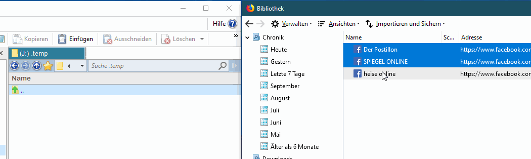 • Ja, innerhalb von Firefox schon, aber probier mal mehrere Lesezeichen zu markieren und dann z. B. auf Deinen Desktop oder in einen Ordner außerhalb von Firefox zu ziehen. Geht bei mir nicht.