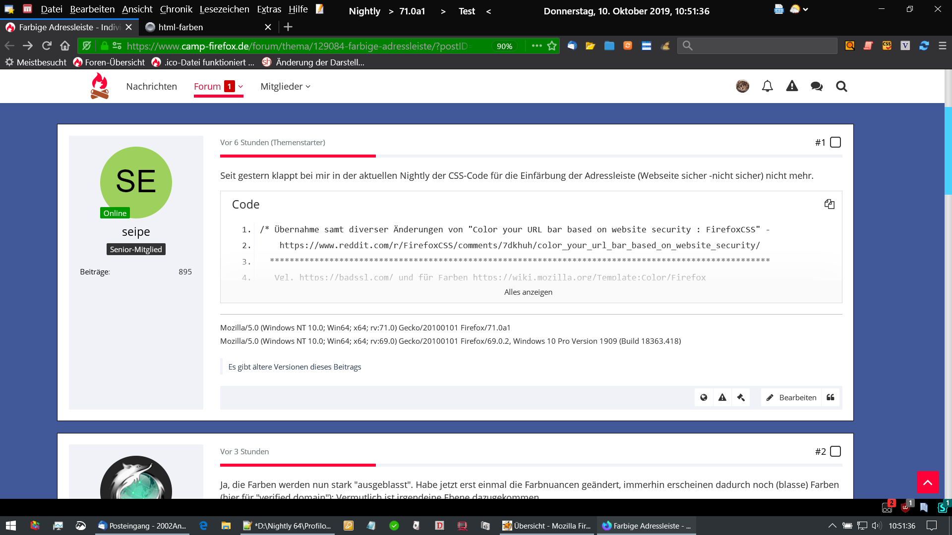 • Seit gestern klappt bei mir in der aktuellen Nightly der CSS-Code für die Einfärbung der Adressleiste (Webseite sicher -nicht sicher) nicht mehr.