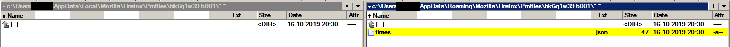 • Das Verzeichnis %APPDATA%\Mozilla\Firefox\Profiles\<TheProfileDir>\ enthält nur die Datei times.json