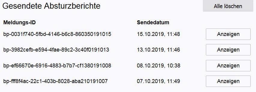 Hier die Links der letzten gesendeten Absturzberichte: