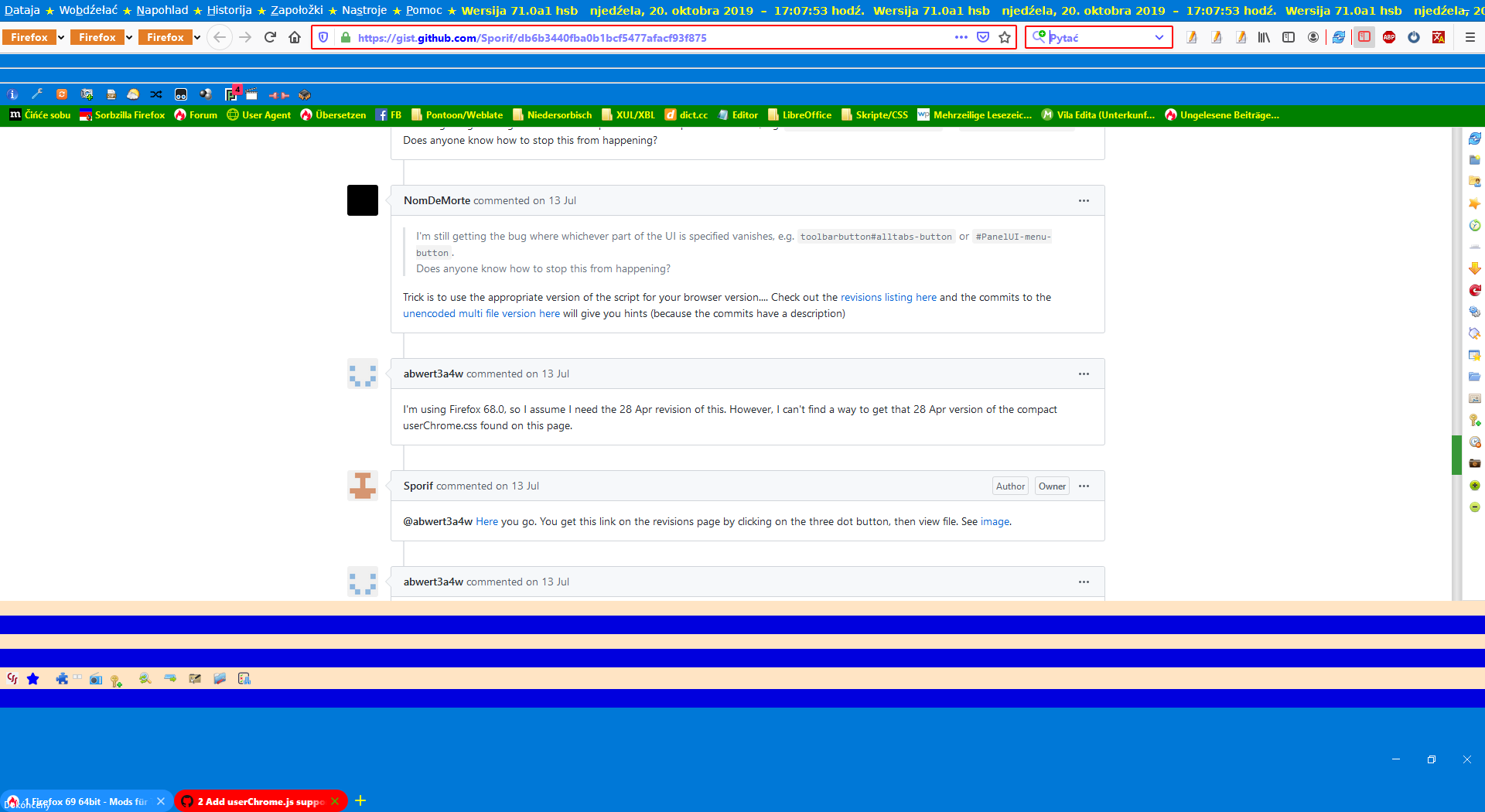 Beide Dateien TabMods.css und TabsUnterLesezeichenleiste.uc.js für sich alleine funktioniern, nutze ich aber beide, werden geschlossen Tabs (egal über X oder mittlere Maustaste) nach einem Neustart über den Button wieder geöffnet.