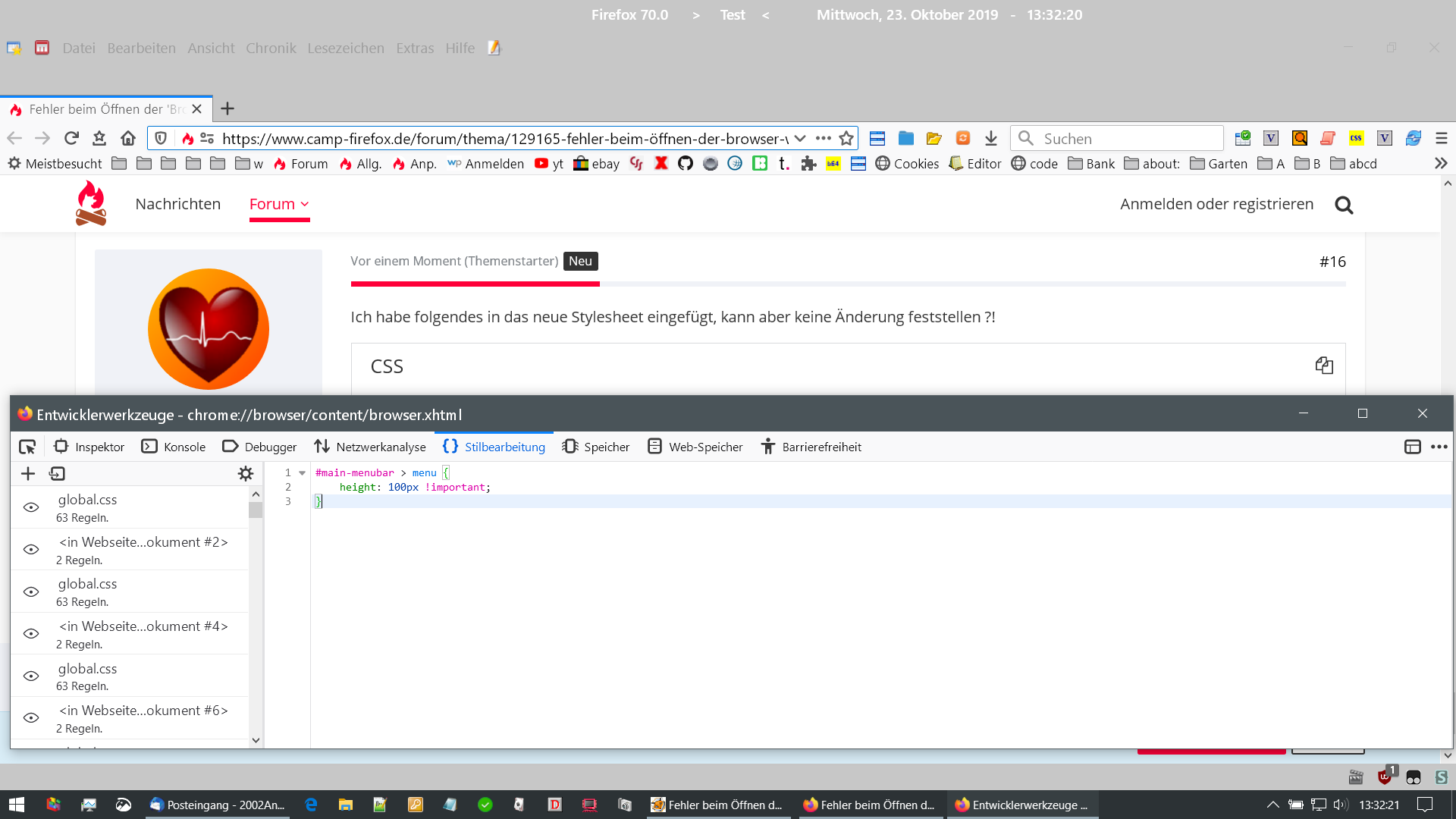 Beim Aufruf von 'Extras' -> 'Web-Entwickler' -> 'Browser-Werkzeuge' öffnet sich ungefähr nach dem fünften(+x) mal nach Aufruf der Browser-Werkzeuge und anschließendem Neustart des Browsers, kein Fenster mehr. Im Taskmanager blitzt nur noch kurz ein neuer FF-Prozess auf und verschwindet sofort wieder. Ab diesem Zeitpunkt lässt sich kein Browser-Werkzeug-Fenster mehr öffnen. Alle anderen Entwicklerwerkzeuge funktionieren noch. Auch im abgesicherten Modus das gleiche Verhalten. Unter FF68ESR und FF69 geht/ging das problemlos...