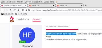 leider funktionert der Code für die abgerundeten Tabs auch bei mir mit ff 70 nicht, der für die orangen Ordner aber schon.