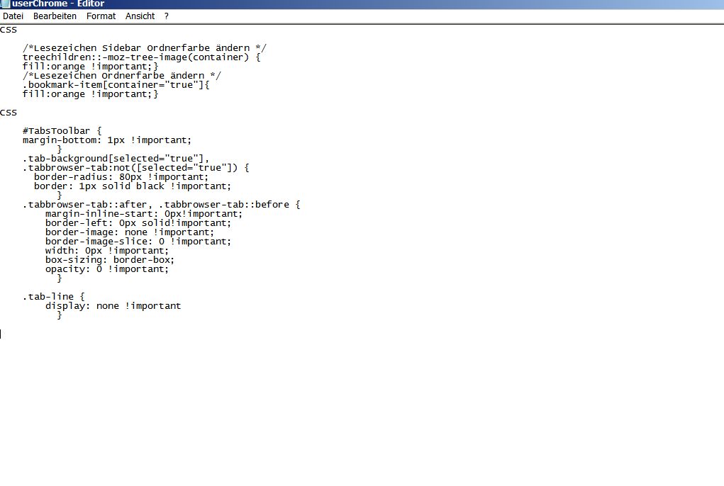 Herman4 Lösche bitte mal die beiden Vorkommen von CSS aus deiner userChrome.css, die hast du versehentlich mitkopiert, führen aber dazu, dass dein Code nicht funktioniert.