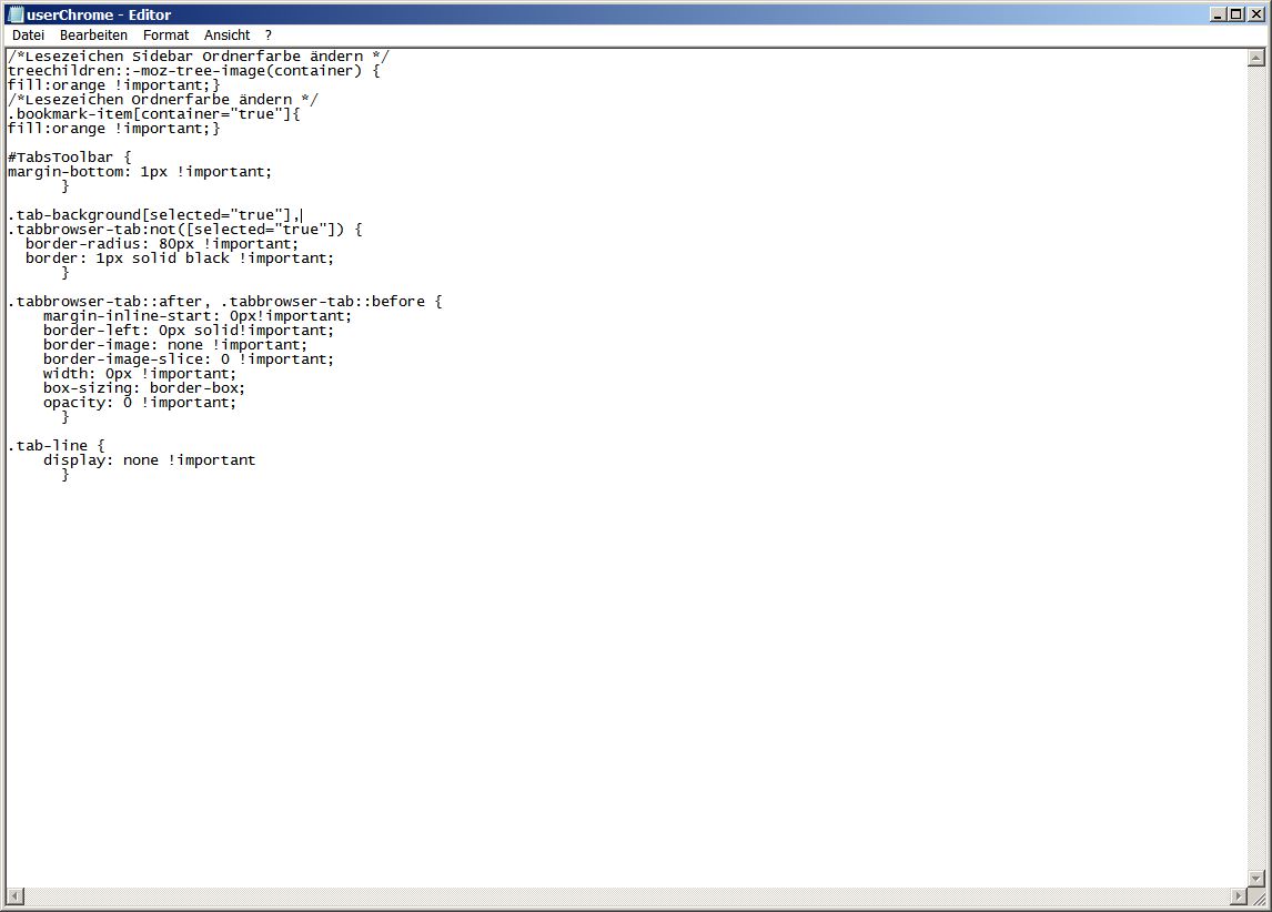 Kopiere jetzt den Code aus Beitrag #2 für die gelben Ordnersymbole und aus Beitrag #3 für die abgerundeten Ecken von 2002Andreas in deine userChrome.css.