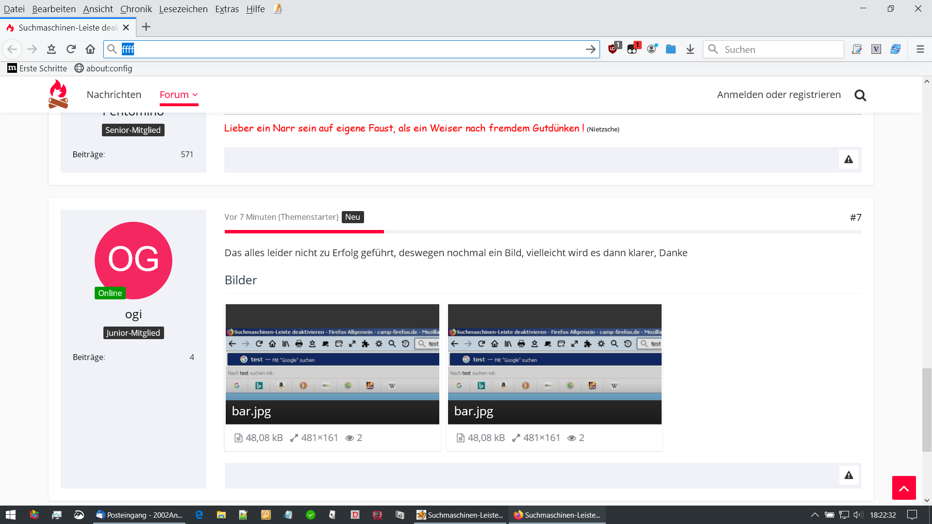 Danke für die Antwort, ich nutze die Adressleiste mittels Schlüsselworten, deswegen keine extra Suchleiste. Win7, Quantum, letzte Version.