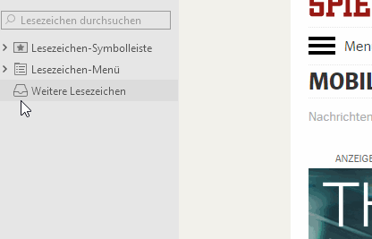 Alles anzeigen@-moz-document url("chrome://browser/content/bookmarks/bookmarksPanel.xul"), url("chrome://browser/content/places/bookmarksSidebar.xul"), url("chrome://browser/content/browser.xhtml"), url("chrome://browser/content/history/history-panel.xul") { #bookmarks-view-children{ margin-left:-12px !important} #sidebar-box { display: block !important; position:fixed!important; top:109px; bottom:-36px; width: 0px !important; overflow-x: hidden !important; -moz-appearance: none !important; border: 1px solid transparent !important; border-left: 0 !important; opacity: 0 !important; -moz-transition: width .2s ease-out .2s, opacity .2s ease-out .2s !important;} #sidebar-box:hover { width: 230px !important; opacity: 1 !important; -moz-transition: width .2s ease-out .2s, opacity .2s ease-out .2s !important;} #sidebar-header { width:100%; border: 0 !important;} #sidebar { width:100%!important; height:95%;} } -