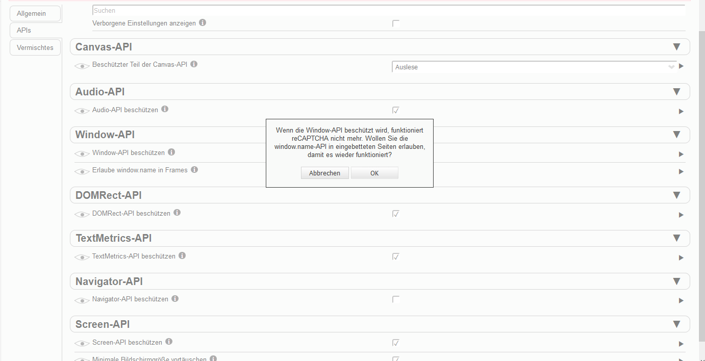 • CanvasBlocker von kkapsner habe ich deinstalliert, weil ich zuletzt mehr Ausnahmen in der windows-api hatte als alles andere. Die Arbeit überstieg den Nutzen, daher Tonne. Und diese Einstellung betrifft ja nicht nur Captchas, sondern auch diverse Popups, alles was mit window erzeugt oder abgefragt wird, auch in Foren.