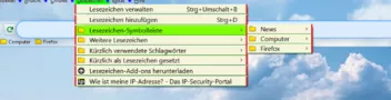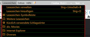 welcher mir die Hintergrund und Textfarbe der Menüpunkte (Datei, Bearbeiten usw und auch das Popupmenü wenn man einen Rechtsklick auf ein Lesezeichen macht) erfolgreich geändert hat. Leider wird der Hintergrund der Menüpunkte Lesezeichen und Chronik nicht geändert. Ich denk mal ein Bild zeigts besser.