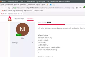 Wenn das allgemein durchgedrungen wäre, hätten wir uns den Umweg mit top: 95px, genauen Wert experimentell ermitteln, sparen können. Ist übrigens nicht nur hier passiert, sondern auch beim Firefox Support Forum und vermutlich noch vielen anderen. Und auch der Code von Github, der auf etlichen Webseiten und auch hier zitiert wurde, hatte die Erkenntnis von Yochaym nicht aufgegriffen. Wir alle hätten bei Github nur etwas weiter schauen müssen, wo die ganze Zeit in mehreren Entwicklungsstufen auch eine tabs_below_navigation_toolbar_fx89.css auf der Basis von Yochaym verfügbar war.
