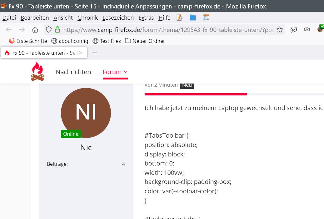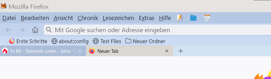 erstmal oute ich mich als Nicht-Profi. Ich bekomme das sonst mit den userchrome.css dateien hin die Tabs wieder nach unten zu holen. Aber egal was ich ausprobiere von den hier angezeigten, meine neueste FF Version übernimmt es einfach nicht. Gibt es für die Version 89.0.2 (32-Bit) womöglich einen anderen Code?