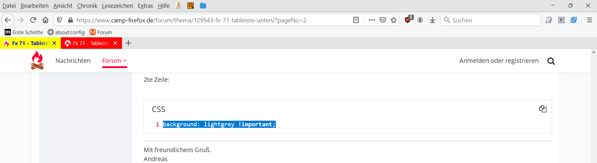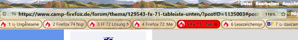 Hat sich erledigt. Der Thread: RE: FF 72 Lösung für Tableiste unter LZ-Symbolleiste gesucht mit der enthaltenen CSS hat mir sehr geholfen.