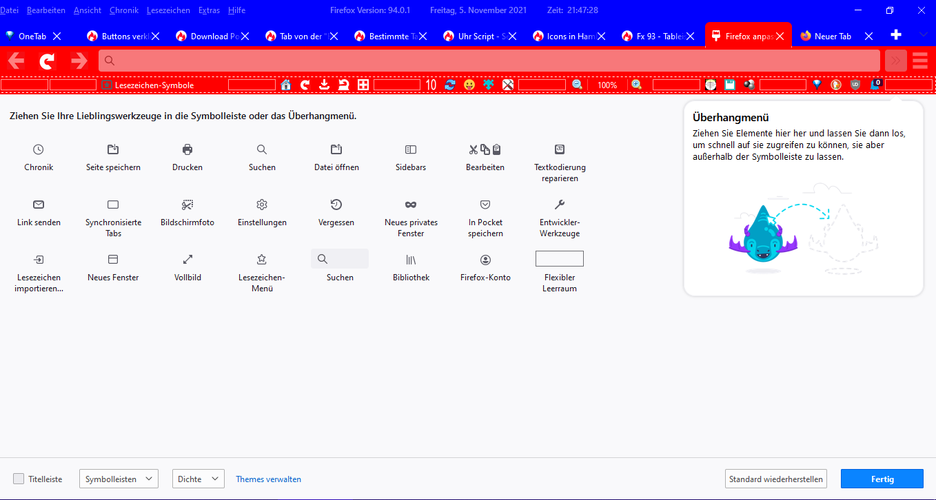Hallo, ich verwende auch eure Codes. Funzt prima. Wäre noch schön zu wissen, ob man die Titelleiste ganz oben weg bekommen könnte? Wenn man in den FF_Einstellungen auf Titelleiste entfernen geht, wird die richtig dick und hässlich wenn man die Tabs unten hat.