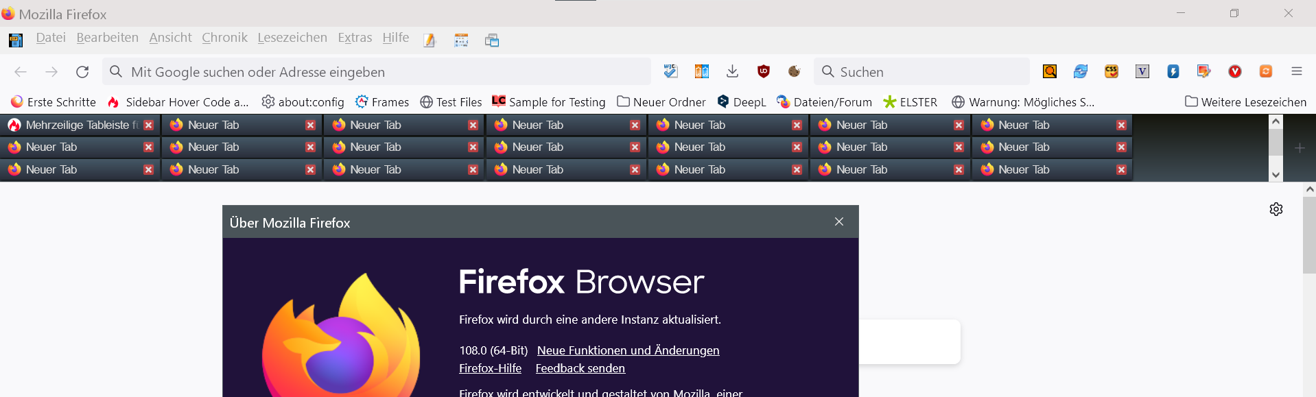 Ich habe soeben im Startbeitrag ein neues Update für FF108 eingefügt, welches die Probleme mit der Menüleiste beheben sollte. Das Ein- und Ausschalten der Menüleiste funktioniert jetzt bei allen horizontalen Anordnungen der Tableiste, mit und ohne eingeschalteter Titelleiste.