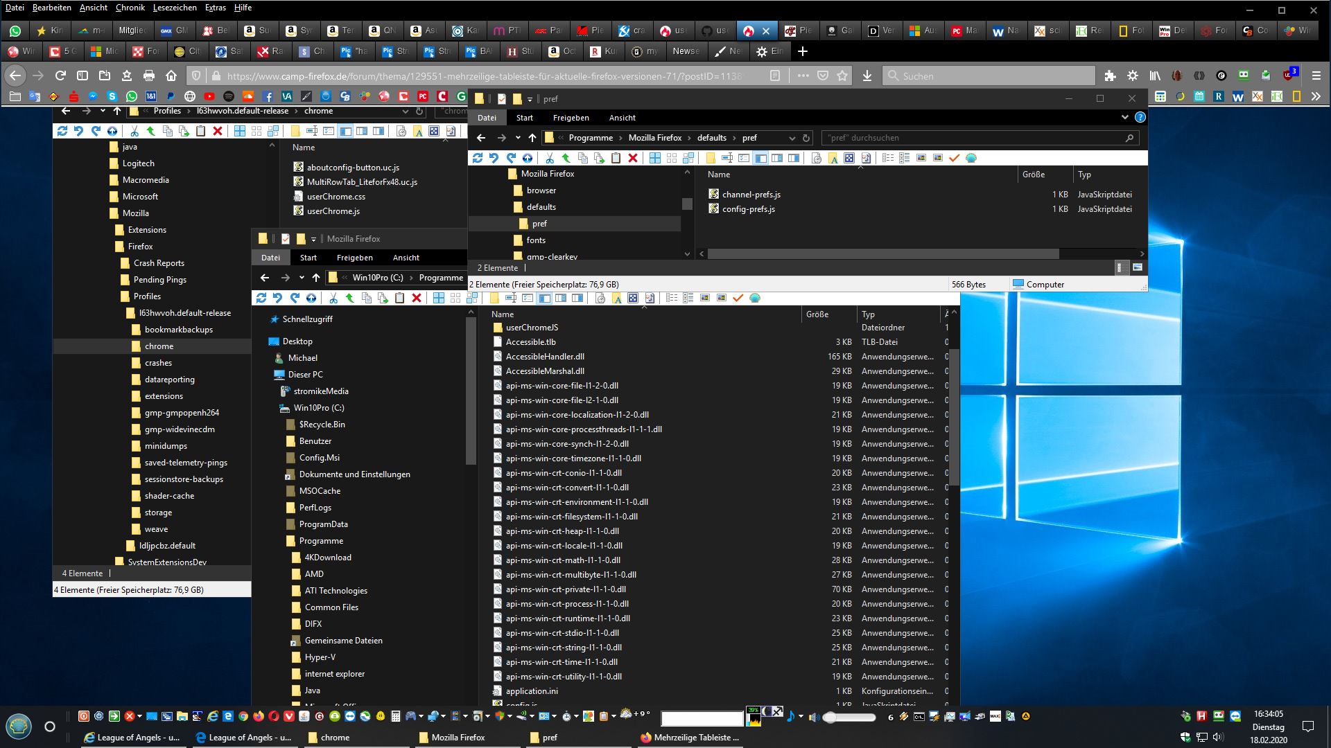• Also Momentan sieht es so aus bei mir. HAb den FF73.01 mal auf andere Partition installiert. Vorher alles gelöscht klar. Dann nur die 2 about:config Einträge toolkit.tabbox.switchByScrolling und toolkit.legacyUserProfileCustomizations.stylesheets auf true gestellt. Dann die CSS Nr2 von der ersten Seite in den Chrome Ordner kopiert. Ergebnis: Browser maximiert sich Tabs sind in meiner Breite 60px und mehrreihig. Nur das Verschieben geht nur nach oben an den Anfang aber damit kann ich leben. Da ich momentan keine der uc.js Scripte brauche ist das jetzt ok so für mich. Einzig die Tabs nach unten bringen wäre noch ganz gut über css. Die 4 Dateien die man da ins Verzeichnis und Chrome Ordner kopieren kann hab ich nicht gemacht. Weil ich denke das da der Hase im Pfeffer liegt. Das mit dem Portablen werde ich aber mal testen und berichten.