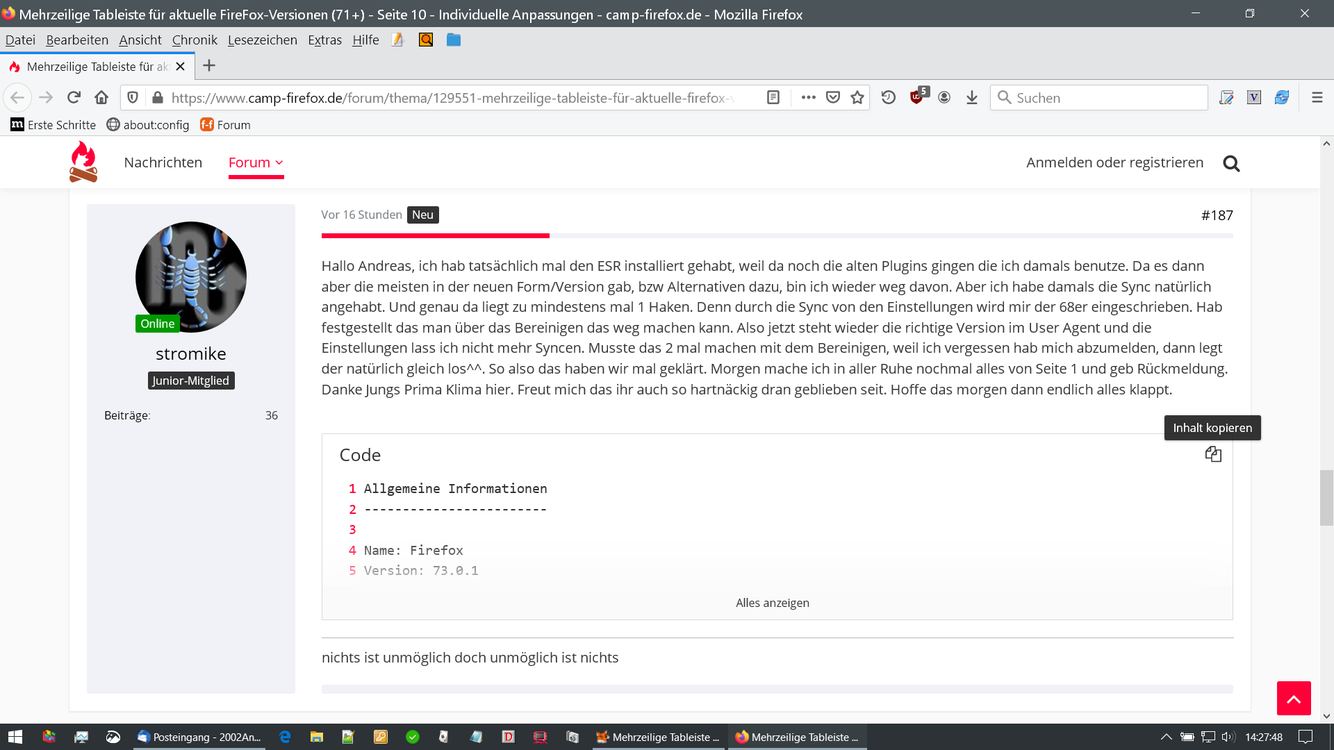 Wie es aussieht, hast du gar keine gemacht. Der Ball liegt bei dir. Du kannst hier nicht Mozilla verantwortlich machen. Wenn nicht aktualisiert wird, könnte z. B. eine user.js schuld sein, die du nicht selbst angelegt hast. Du hast die ja vorhin schon mal erwähnt.
