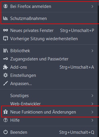 /*** Hamburger Menü ***/#appMenu-fxa-container, /* Sign in to Sync / Open Sync preferences / Reconnect to Sync */#appMenu-fxa-container + toolbarseparator, /**** Separator ****/#appMenu-new-window-button, /* New Window */#appMenuRestoreLastSession + toolbarseparator, /**** Separator ****/#appMenu-zoom-controls, /* Zoom */#appMenu-zoomReduce-button, /* Zoom out */#appMenu-zoomReset-button, /* Reset zoom level */#appMenu-zoomEnlarge-button, /* Zoom in */#appMenu-zoomEnlarge-button + toolbarseparator, /* Vertical Separator */#appMenu-zoom-controls + toolbarseparator, /**** Separator ****/#appMenu-edit-controls, /* Edit */#appMenu-cut-button, /* Cut */#appMenu-copy-button, /* Copy */#appMenu-paste-button, /* Paste */#appMenu-open-file-button, /* Open File… */#appMenu-save-file-button, /* Save Page As… */#appMenu-print-button, /* Print… */#appMenu-print-button + toolbarseparator, /**** Separator ****/#appMenu-find-button, /* Find in This Page… */#PanelUI-helpView [oncommand^="openFeedbackPage()"] /* Submit Feedback… */ { display: none !important; }
