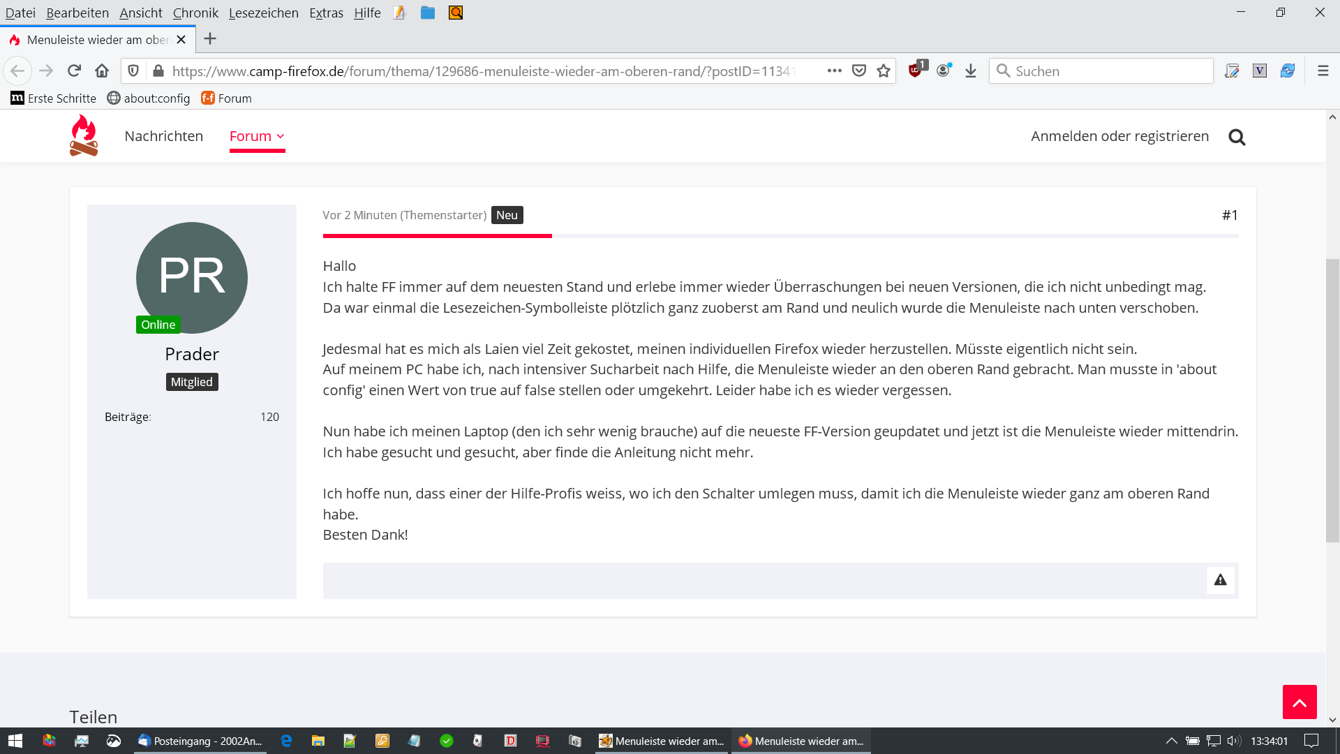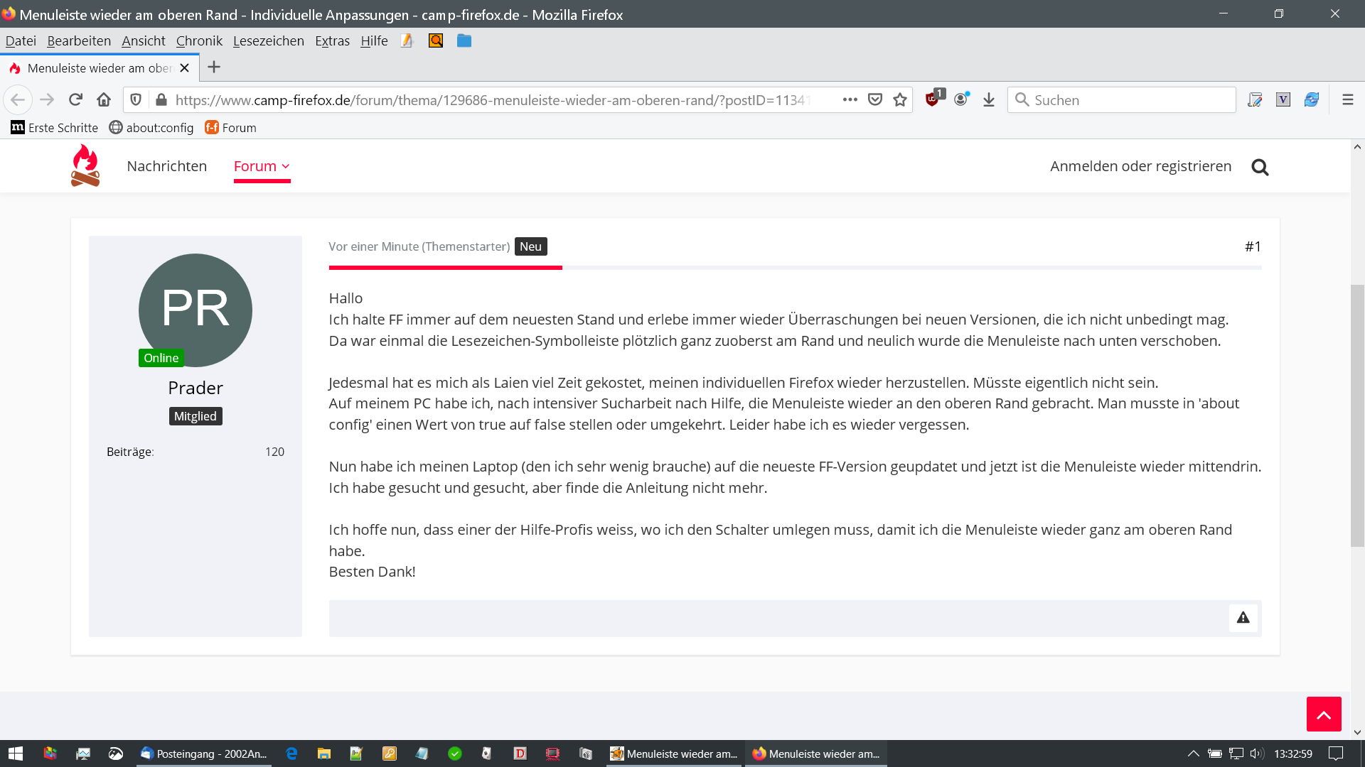 Nun habe ich meinen Laptop (den ich sehr wenig brauche) auf die neueste FF-Version geupdatet und jetzt ist die Menuleiste wieder mittendrin.