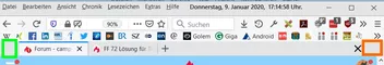 - Rechts (orange markiert) verschiebt sich das Tab-Schließen-Kreuz (AddOn Close Current Tab, für mich zweckmässig wenn ich mehrere Tabs hintereinander schließen will) durch einen Leerraum nach links.