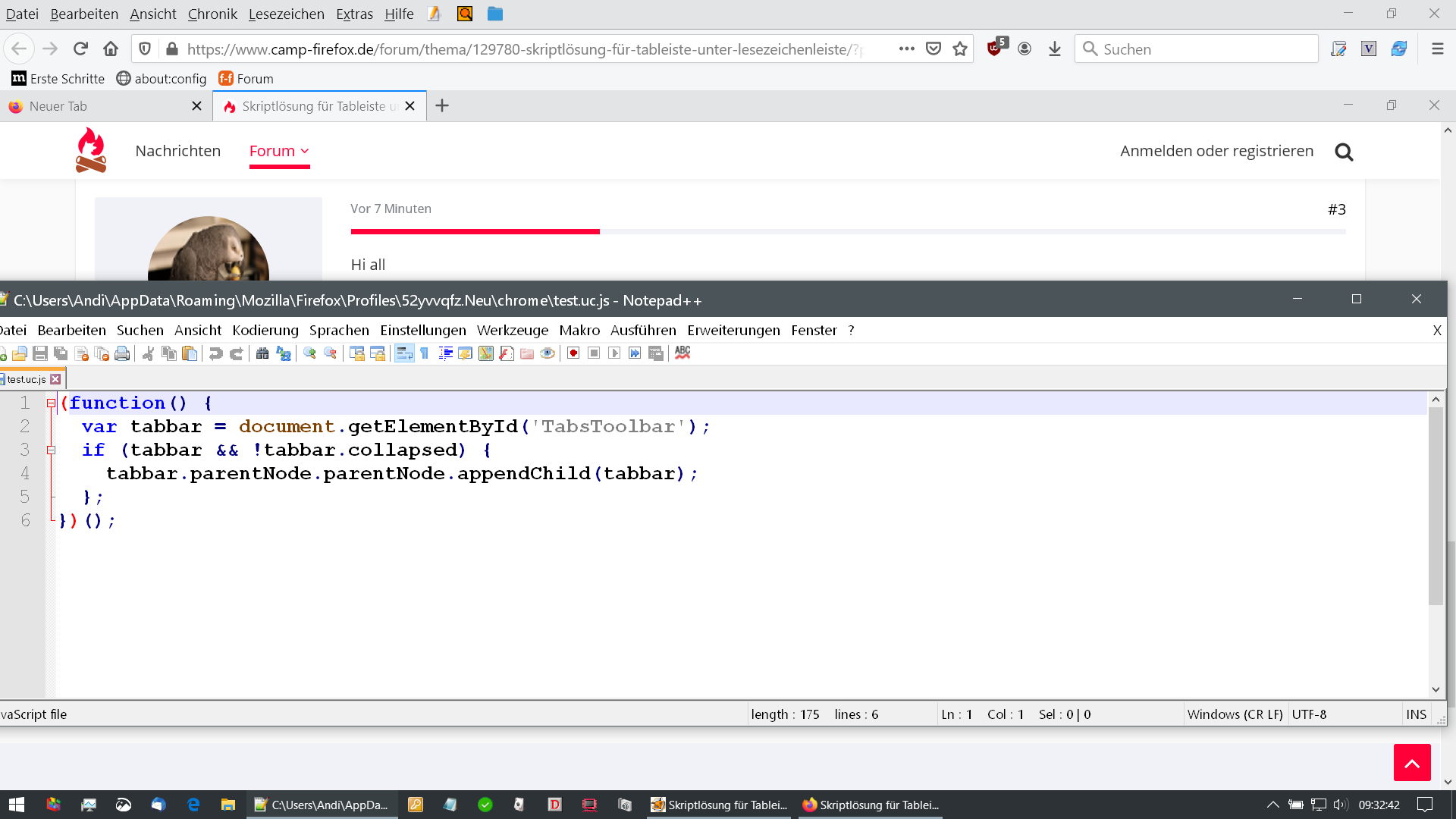 dieser Beitrag richtet sich an alle, die lediglich die Tableiste unter der Lesezeichenleiste haben wollen. Im Unterschied zu den bisher angebotenen Lösungen basiert diese Lösung nicht auf CSS-Code, sondern ist ein kurzes Benutzerskript. Es hat also überhaupt nichts mit CSS zu tun! Das Skript bringt nur die Tableiste unter die Lesezeichenleiste und macht nichts Anderes! Keine CSS-Anpassungen, keine mehrzeilige Tableiste! Wer sowieso mit Benutzerskripten arbeitet, kopiert sich den Code in eine Textdatei mit der Dateiendung .uc.js ab und speichert diese im Ordner chrome des Profilverzeichnisses ab.