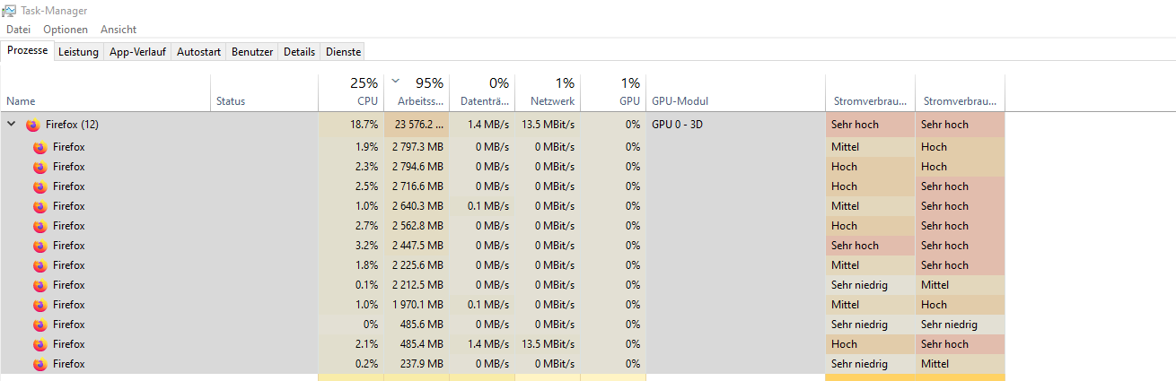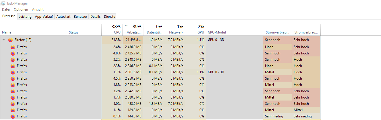 Wenn ich zwei oder 3 Facebook Webseiten (Tabs) offen habe und etwa 30 Minuten lang auf der Facebook Webseite runter scrolle, dann füllt sich der Speicher rasant auf 5 GB an, aber ich habe das mit etwa 100 Facebook Tabs gemacht und Firefox hat schlussendlich fast mein gesamter Arbeitsspeicher gefüllt, fast 24 GB! Ich habe schon unzählige Firefox Version ausprobiert immer den gleichen Fehler! Ich habe auch mein Firefox Profil zurückgesetzt und etliche Tipps und Ratschläge befolgt aber alles hatte nichts gebracht!
