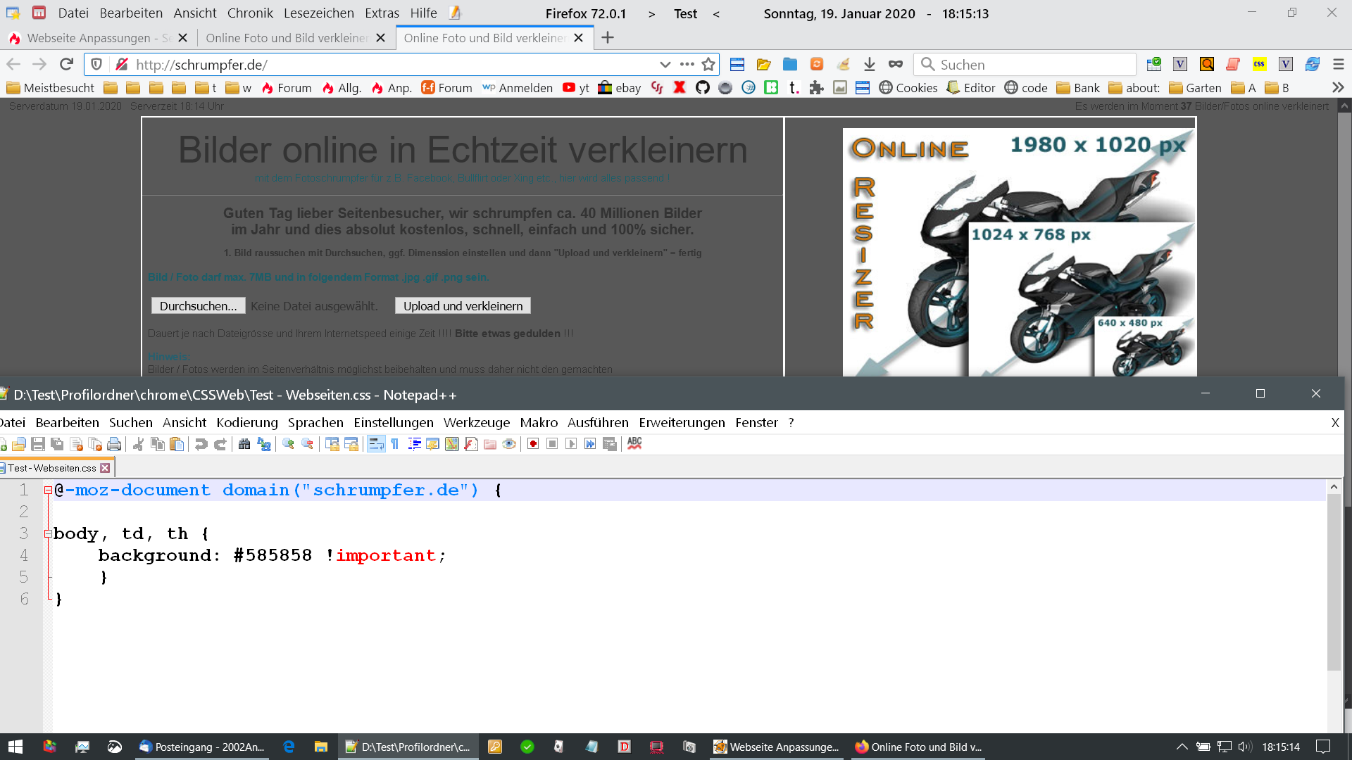In seinem ersten Link aus #15 steht 'http://www.schrumpfer.de' und in dem Screenshot, den er von der 'userContent.css' gepostet hat 'http://schrumpfer.de'. Und genau nach dem ich auf die unterschiedliche URL aufmerksam gemacht habe, funktionierte es plötzlich. :/