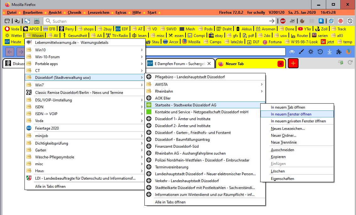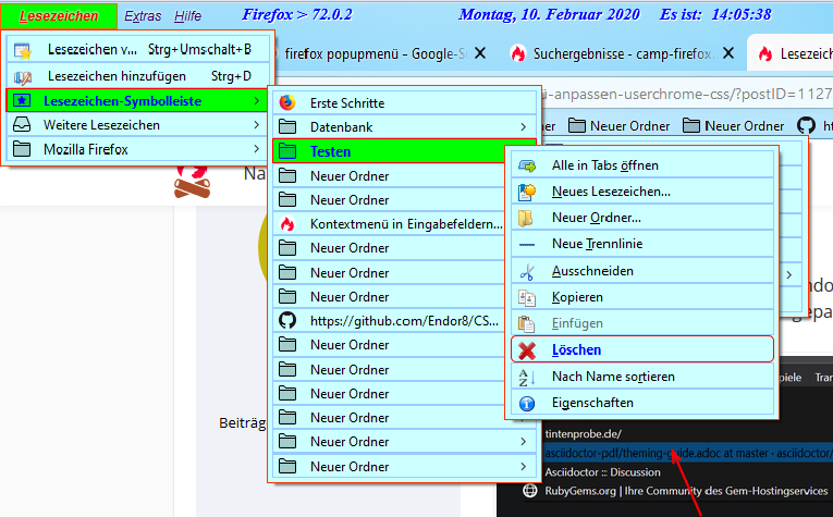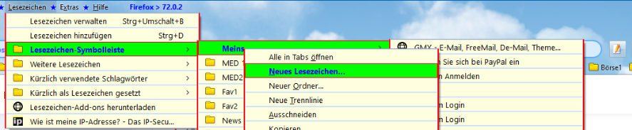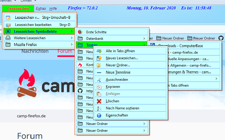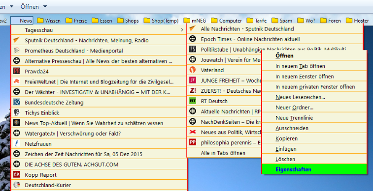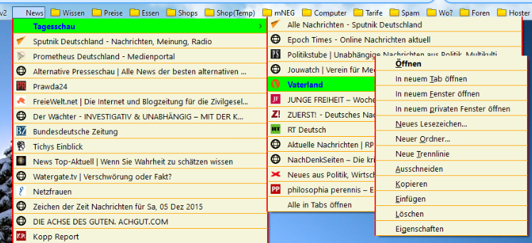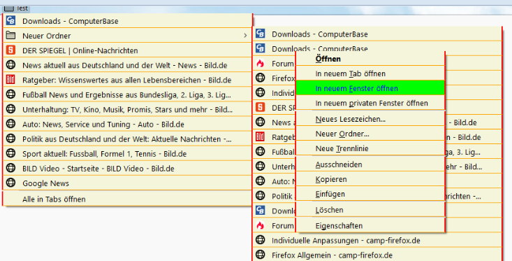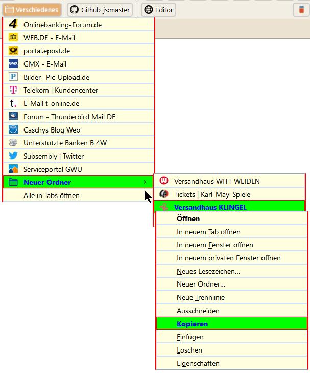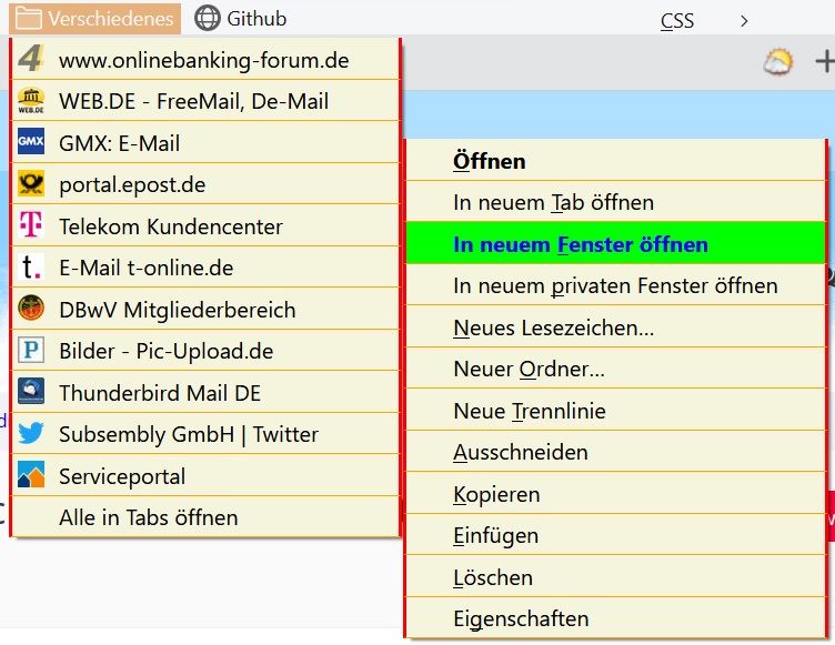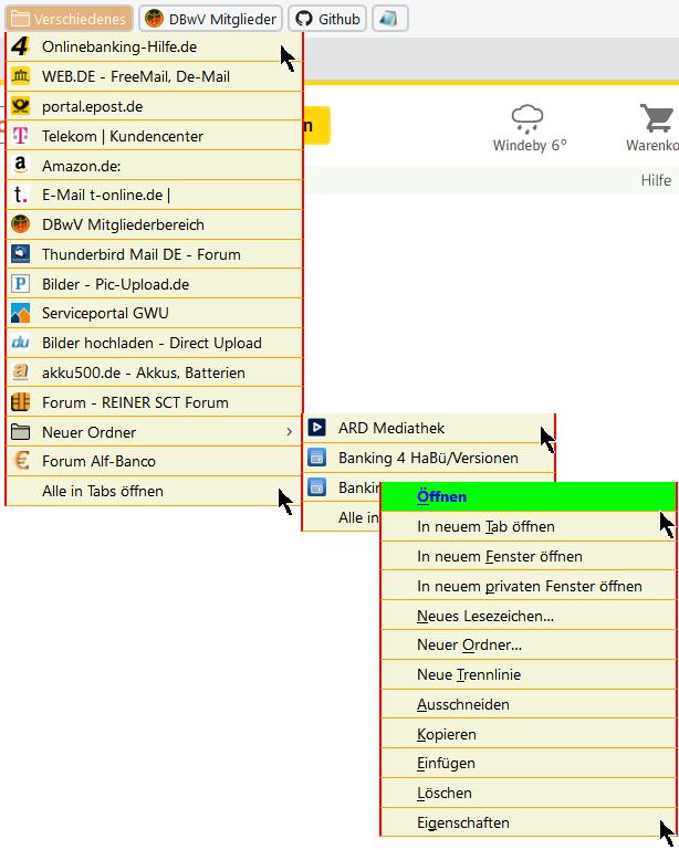 Öffne ich einen Lesezeichen-Ordner, und fahre mit der Maus über die Einträge, so verändern sich Schrift und Hintergrund. Öffne ich nun über einem Link das Kontext-Menü, so wird es angezeigt, aber beim Überfahren mit der Maus keine Änderung, sondern die Einträge sind ganz normal anklickbar. Hier ein Bild dazu: