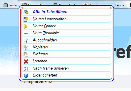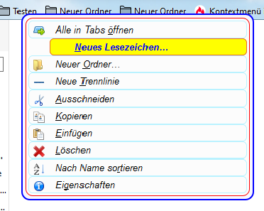 Jetzt das Problem, es vertragen sich einige Codes nicht, wenn sie zusammen verwendet werden. Weil in meinem und auch in dem von Endor der Hover-Effekt mit eingebaut ist (ständiges Flackern beim Überfahren mit der Maus). Nun habe ich aus dem Code für die betreffenden Kontextmenüs die Hover-Bestandteile gelöscht. Damit ist das Flackern weg, und es wird aus meinem Code auch die fette blaue Schrift angezeigt, aber es fehl natürlich der Hintergrund . Das betrifft die Kontextmenüs aus der Lesezeichen-Symbolleiste für Ordner und einzelne Lezezeichen (siehe Bilder).