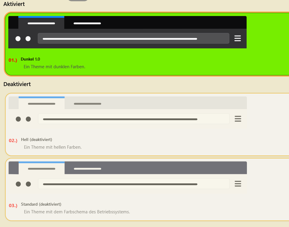 Jetzt habe ich mich noch mal daran gemacht, den bisherigen Code vollständig zu überarbeiten. Meines Erachtens nach müsste alles sauber laufen , die Container bei Themes sind in der Höhe reduziert, mehr geht wohl nicht.