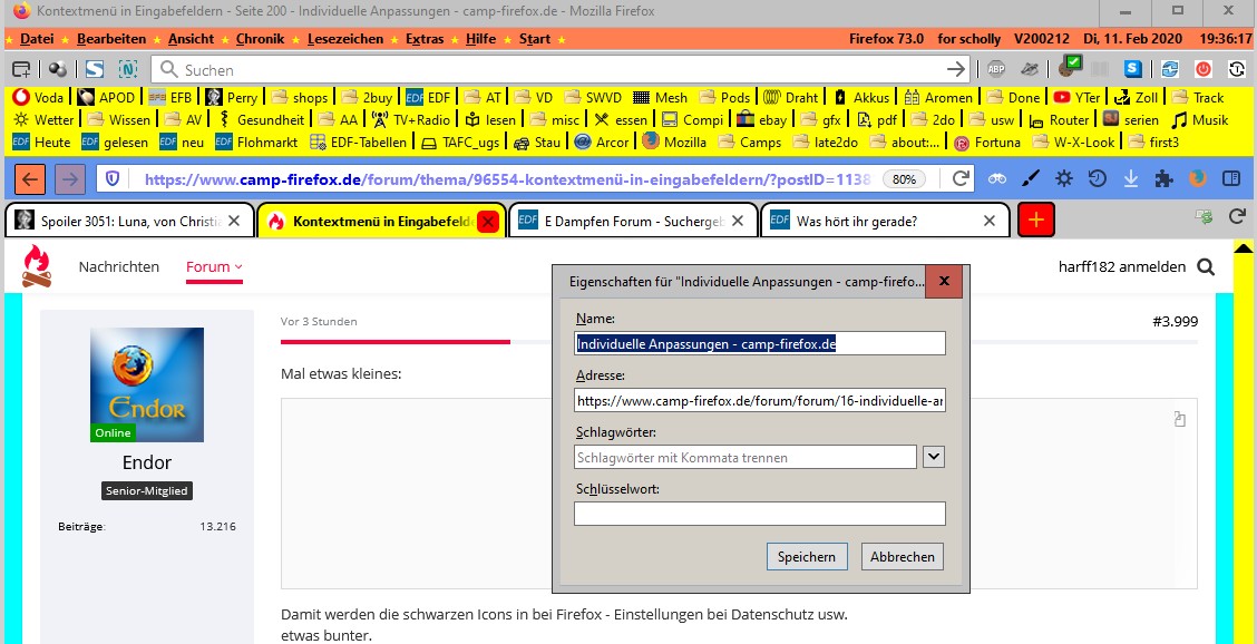 Damit ich am nächsten Tag jeweils beim zuletzt gelesenen Beitrag in den jeweiligen Threads lande, update ich die Bookmarks händisch, bevor ich FF runterfahre.