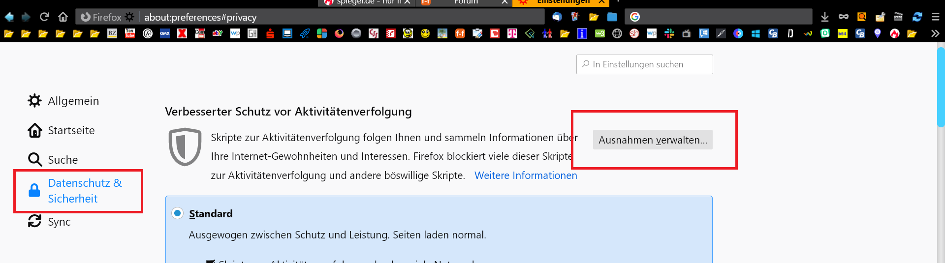 Was kann ich tun, um http://www.spiegel.de weiterhin nutzen zu können (zumindest die kostenlosen Artikel), ohne gleichzeitig die Sicherheitsstandards des Firefox (Standardeinstellung) bezüglich Aktivitätenverfolgung aufgeben zu müssen? Es geht nicht um den privaten Modus, sondern ein "normales" Fenster.