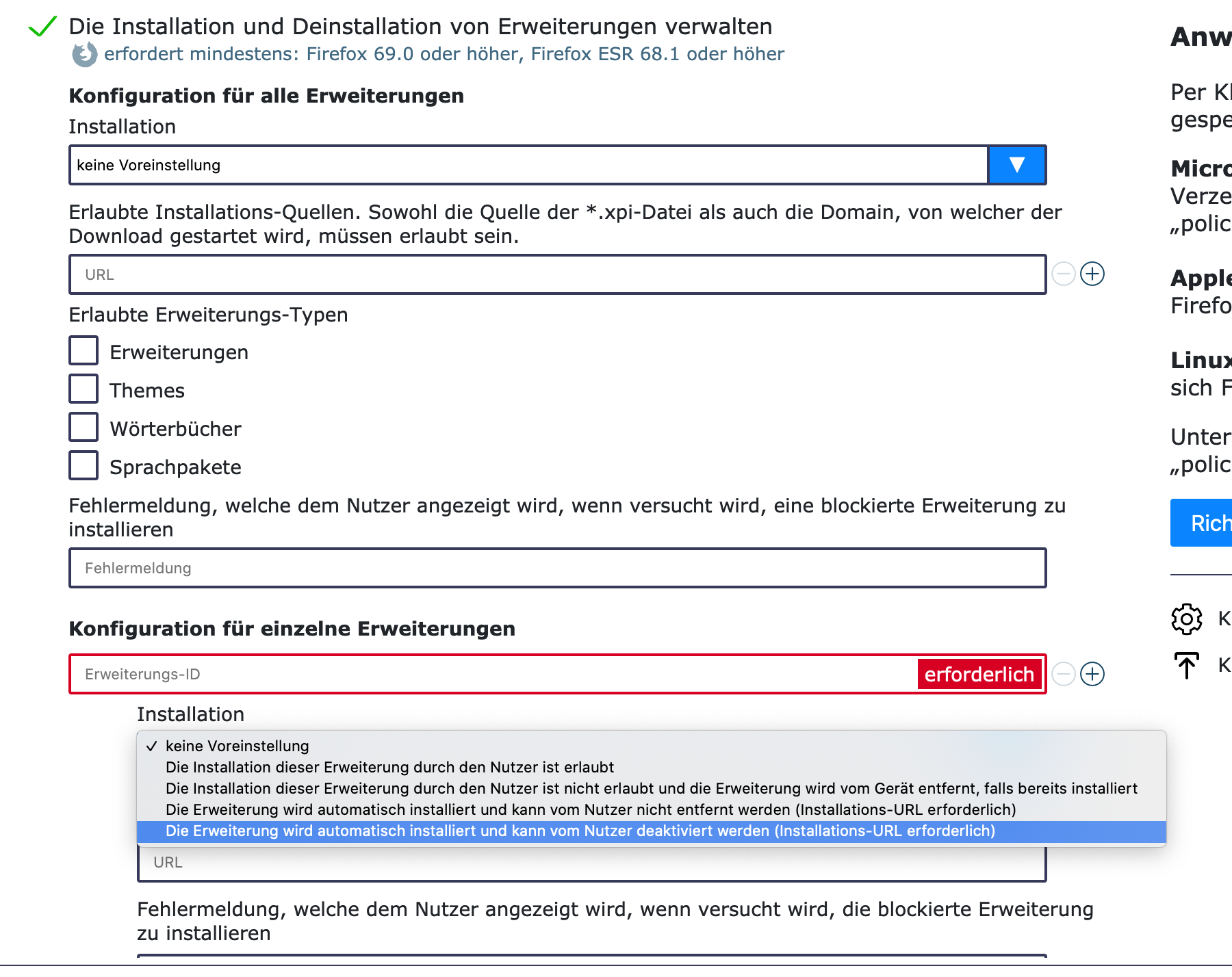 • Schau dir die Richtlinie im Policy Enterprise Generator genau an. Das sollte relativ selbsterklärend sein. Und falls noch, dann stelle nochmal hier eine konkrete Nachfrage. Um die Frage nach der Erweiterungs-ID gleich vorwegzunehmen, da das die häufigste Frage ist, die ich bisher erhalten habe: Installiere die Erweiterung, dann findest du die ID unter about:support.