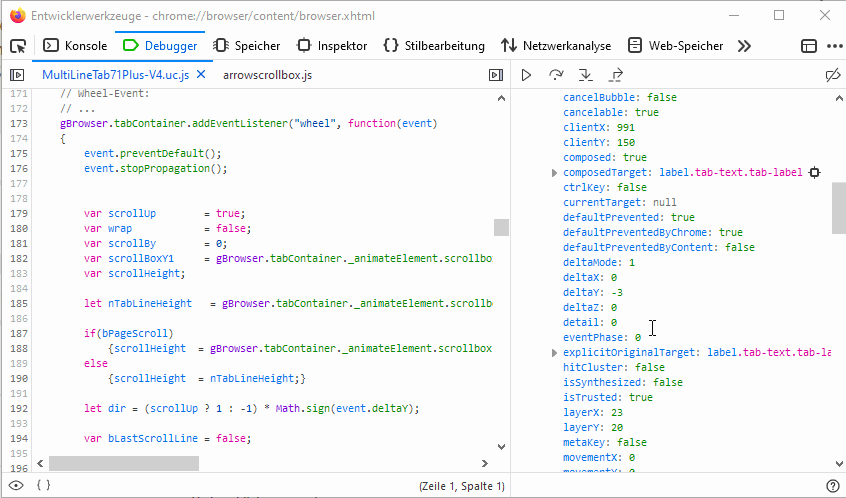 Wenn ich mir z.B. Attribute eines 'event'-Parameters innerhalb einer Funktion mit dem Debugger anschauen möchte, dann werden mir unter 'Geltungsbereiche' nicht alle Attribute (z.B: 'target:') angezeigt, sprich: der Zweig wir trotz entsprechender Pfeil-Markierung nicht expandiert. Wenn ich den Wert direkt in dem kleinen Hover-Popupfenster im Quellcode untersuche funktioniert alles einwandfrei.