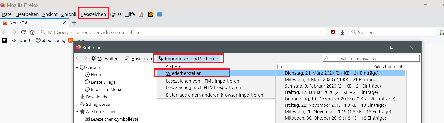 Ich habe aus versehen einige Ordner in der Lesezeichen-Symbolleiste gelöscht und versuche verzweifelt einen weg diese wieder herzustellen.