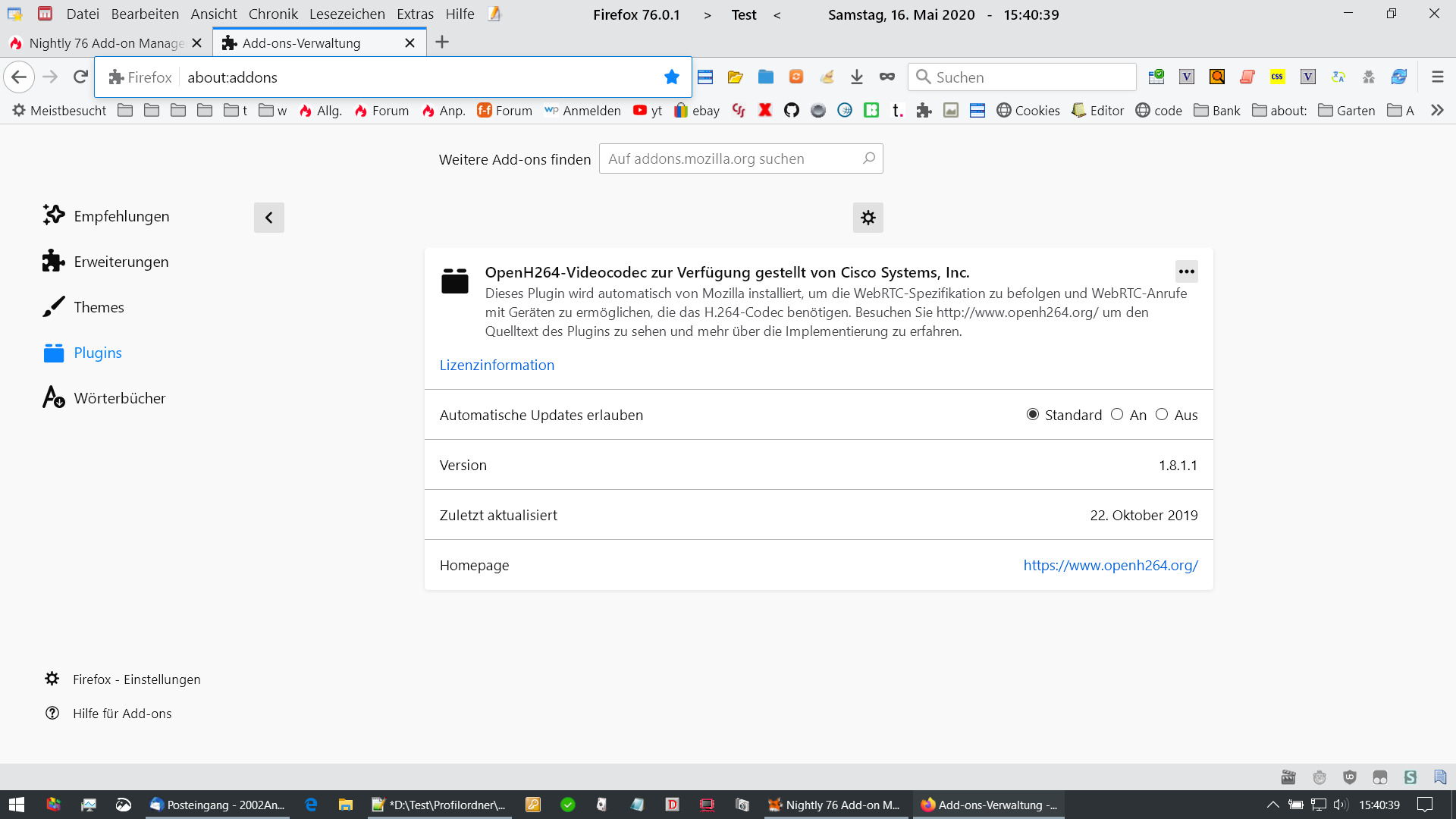 CSS@-moz-document url-prefix(chrome://mozapps/content/extensions/aboutaddons.html), url-prefix(about:addons) { html body div#full div#content div#main div addon-card div.card.addon{ min-width: 1100px !important; } }Damit wird nur unter Plugins das Feld erweitert, sonst war auch Themes betroffen.